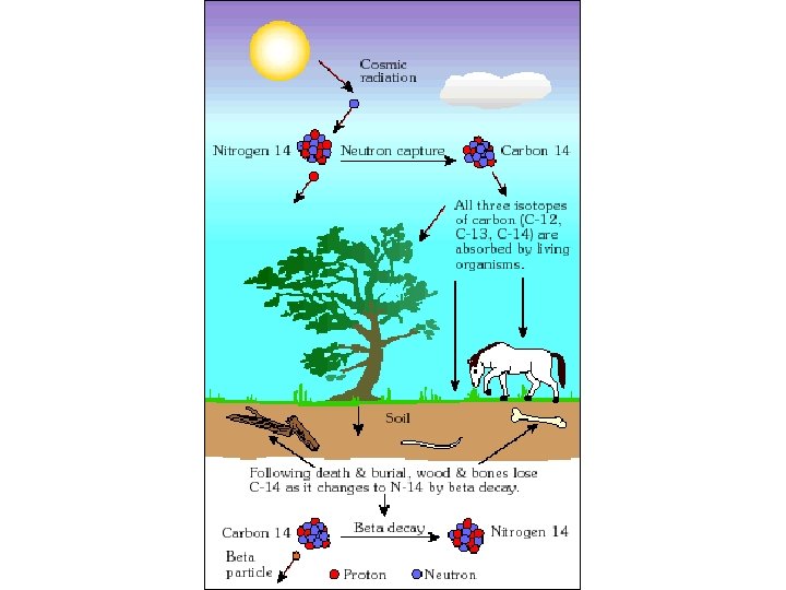 Radioactive Dating Example: Carbon-14 ● Used to date material that was once alive ● C-14 is in all plants and animals – C-12 is too, but it does NOT decay! ● When an organism dies, the amount of C-14 decreases because it is being converted back to N-14 by radioactive decay