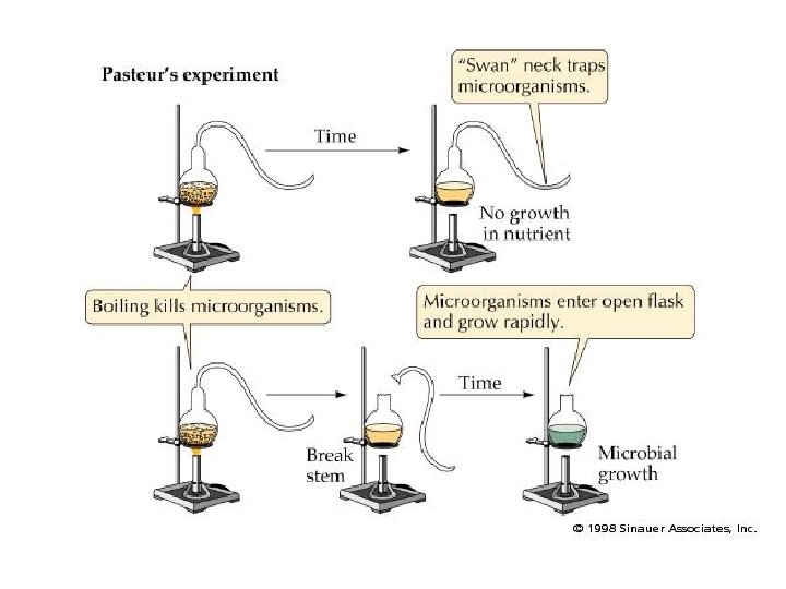 Pasteur’s Test of Spontaneous Generation • Pasteur’s experiment: –Expose the flasks (with boiled broth) to air –BUT: Protect one sample of broth from microorganisms by curving the neck
