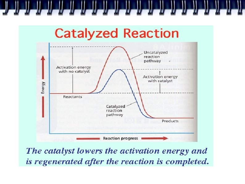 Catalysts A substance that increases the rate of a chemical reaction by lowering activation energies but is not itself consumed in the reaction. Example: Enzymes: allow many chemical rxns to occur at a rate that sustains life at normal living temperatures