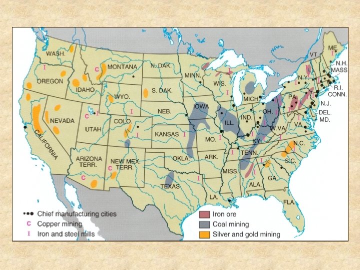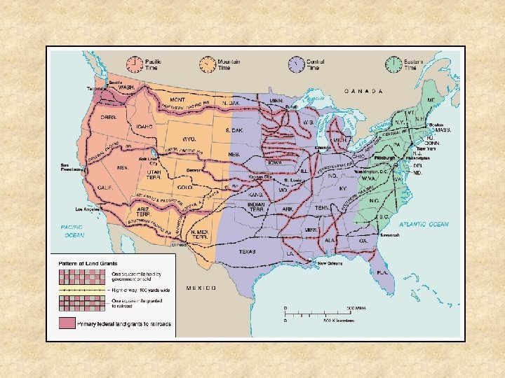 Transcontinental Railroad 1. Railroad that connects the continent east to west 2. Contributes to the growth of towns & cities 3. Built with Irish & Chinese laborer Promontory Point, UT (May 10, 1859)_