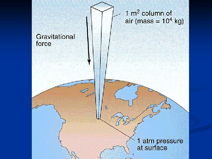 Atmospheric Pressure • Atmospheric gases have mass. • Atmospheric gases extend hundreds of kilometers above Earth's surface. • As Earth's gravity pulls the gases toward its surface, the weight of these gases presses down on the air below.