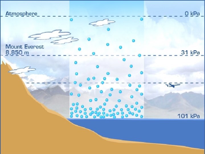 Air pressure is greater near Earth's surface and decreases higher in the atmosphere. People find it difficult to breathe in high mountains because fewer molecules of air exist there.