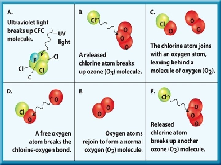 • Chlorofluorocarbon molecules destroy ozone. • When a chlorine atom from a chlorofluorocarbon molecule comes near a molecule of ozone, the ozone molecule breaks apart. • One of the oxygen atoms combines with the chlorine atom, and the rest form a regular, two-atom molecule.