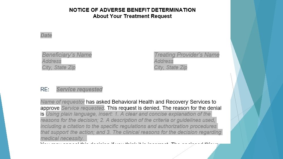 Sample NOABD Modification Notice “Your Network Provider, Sally Therapist, asked us to authorize therapy for you 3 times per week for the next 3 years. Instead, we authorized 16 therapy sessions for you for the next four months. Your provider may document the need for additional services before this authorization ends and we will review her request. ”