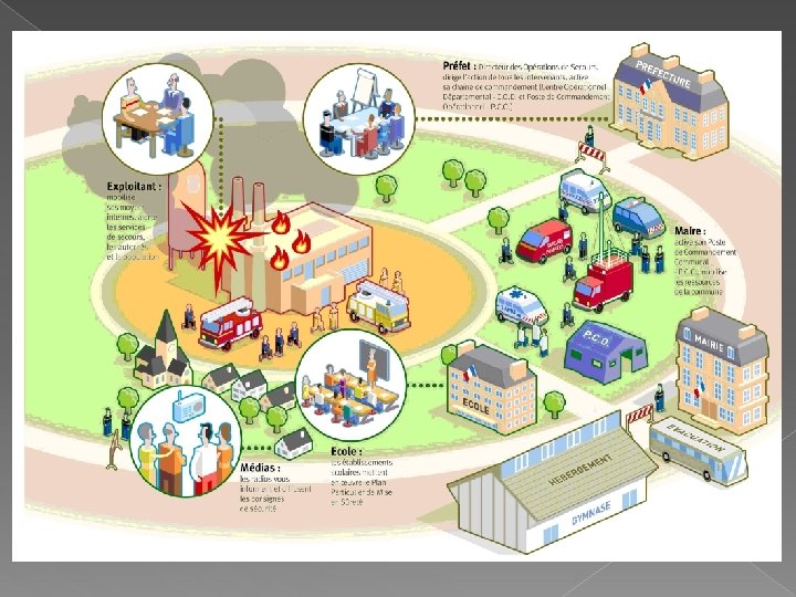DISPOSITIF OPERATIONNEL v Dispositif opérationnel : -Dispositif général : SAMU, Pompiers, Police, Gendarmerie, ambulances privées, secouristes, Sec. Civ, Militaires… -Plan Bleu: Bleu Etablissement d’accueil des personnes âgées -Plan Rouge (ORSEC No. Vi): Nombreuses victimes. -Plan Blanc: Etablissements de Santé -PPI , PPS : Entreprises chimiques, barages hydrolyques, établissements scolaires. -PCS : Plan communal de Sauvegarde