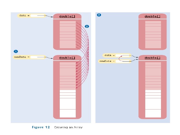 Agrandir un Array Si un Array (data) n’est pas asez grand: • Créer un nouveau Array plus grand: double[] new. Data = new double[2 * data. length]; • Copier les éléments dans le nouveau Array: System. arraycopy(data, 0, new. Data, 0, data. length); • Réaffecter la référence (data) au nouveau Array: data = new. Data;