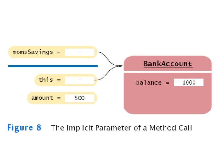 this • Cette référence spéciale permet de référer au même objet à partir duquel la méthode est appelée (objet courant) • E. g. public class Bank. Account { … public void withdraw(double amount) this. balance { double new. Balance = balance - amount; balance = new. Balance; } … public double balance; } Bank. Account more. Savings = new Bank. Account (1000); int balance; more. Savings. withdraw(500);
