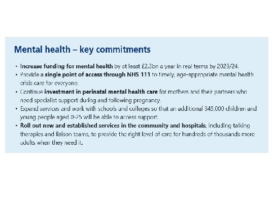 • Develop new services for children with complex needs. For 6, 000 highly vulnerable children with complex trauma, this will provide consultation, advice, assessment, treatment and transition into integrated services. • Extend current MH services to create comprehensive offer for 0 -25 year olds • Expanding timely, age-appropriate crisis services(via NHS 111, A&E, paediatric, ambulance services)