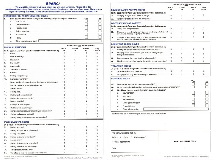SPARC© content • 45 questions, 56 possible responses, covering seven areas of potential need: Communication and information Physical Psychological Religious and spiritual Independence and activity Family and social Treatment Personal • free-text area to report other concerns.