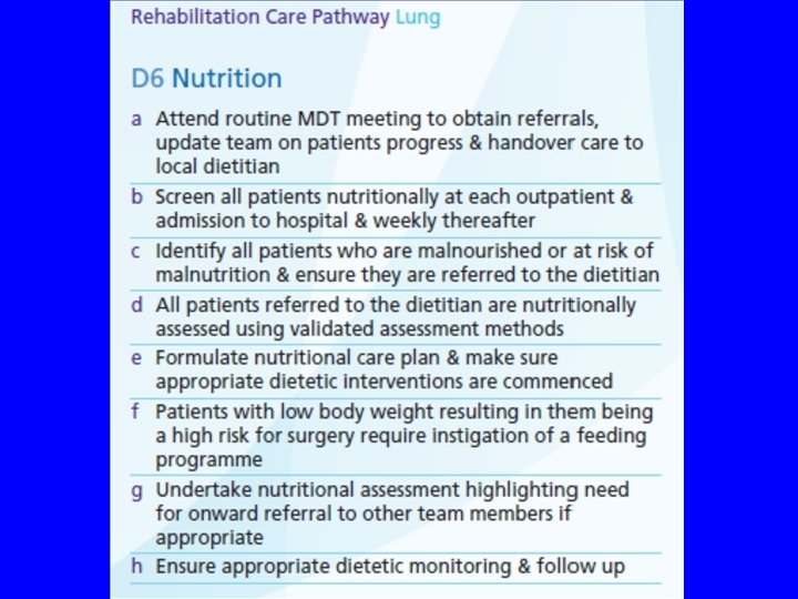 Lung cancer CARE service • dedicated to all people with thoracic cancer • particular focus on the effects of cachexia • fulfils national guidance – HNA – rehabilitation • integrated with lung cancer and specialist palliative care services.