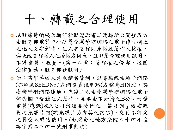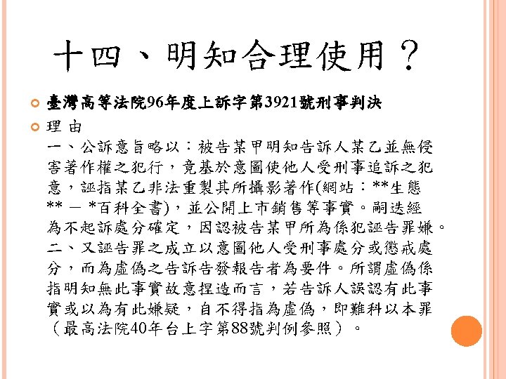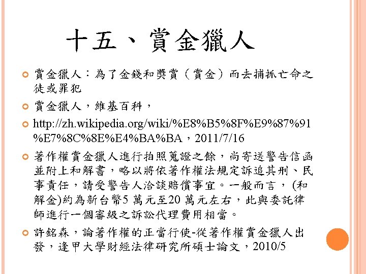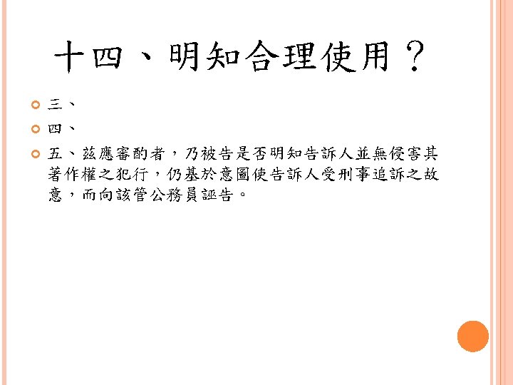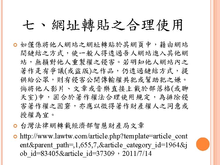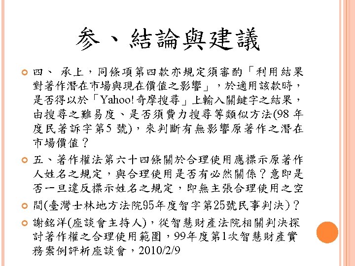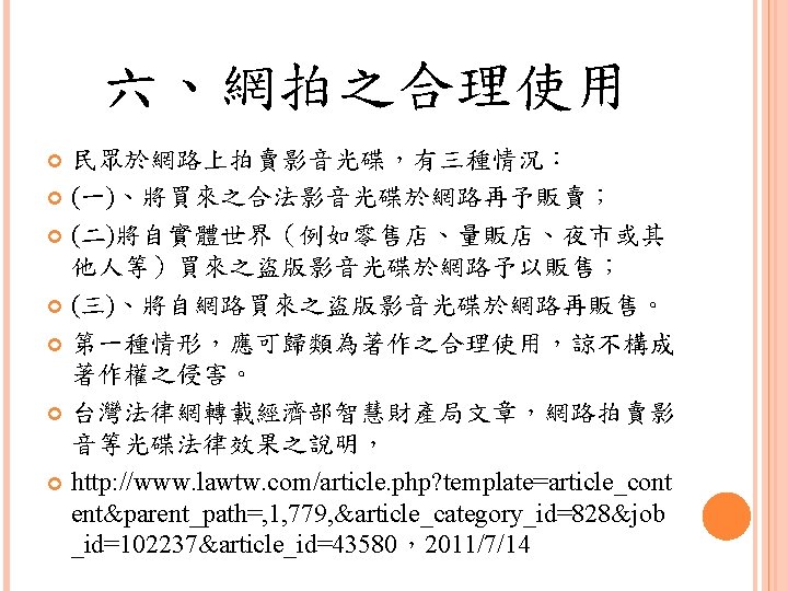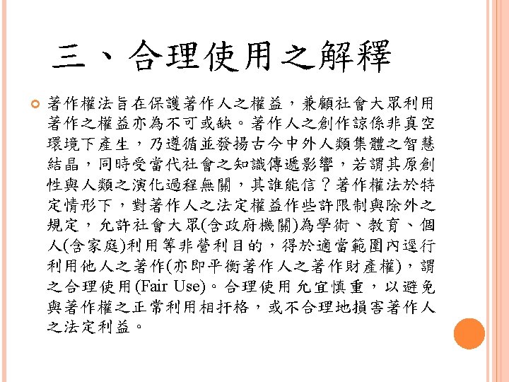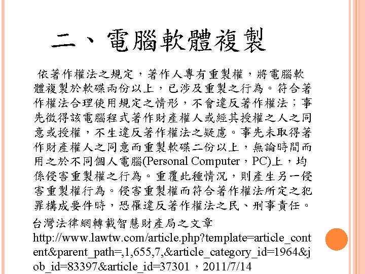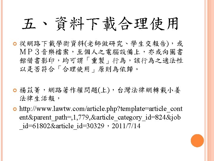 四、合理使用之判定參考 Lawrence Steingold, Technology and Employer Update: Court Eliminates Defenses for Downloading Copyrighted Materials, Querrey & Harrow, http: //www. querrey. com/assets/attachments/134. pdf, 2011/7/16 Copyright Act, Section 106, U. S. A. :Exclusive rights in copyrighted works Copyright Act, Section 107, U. S. A. :Limitations on exclusive rights: Fair use