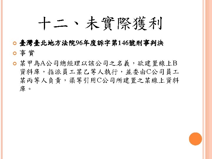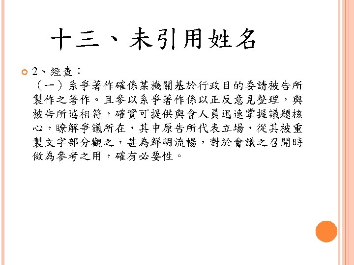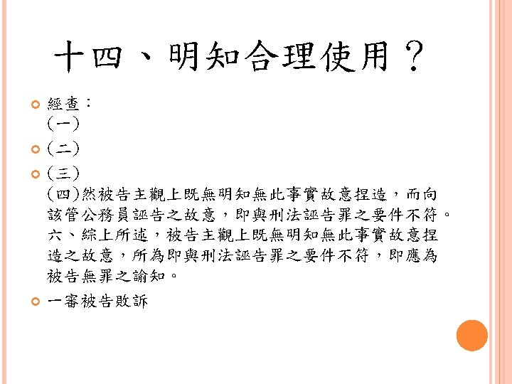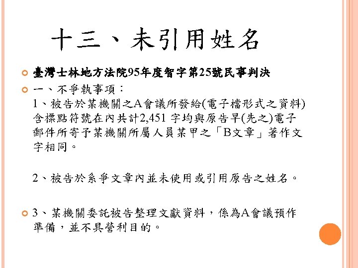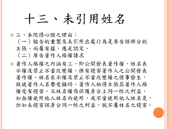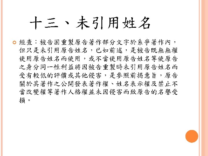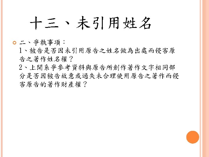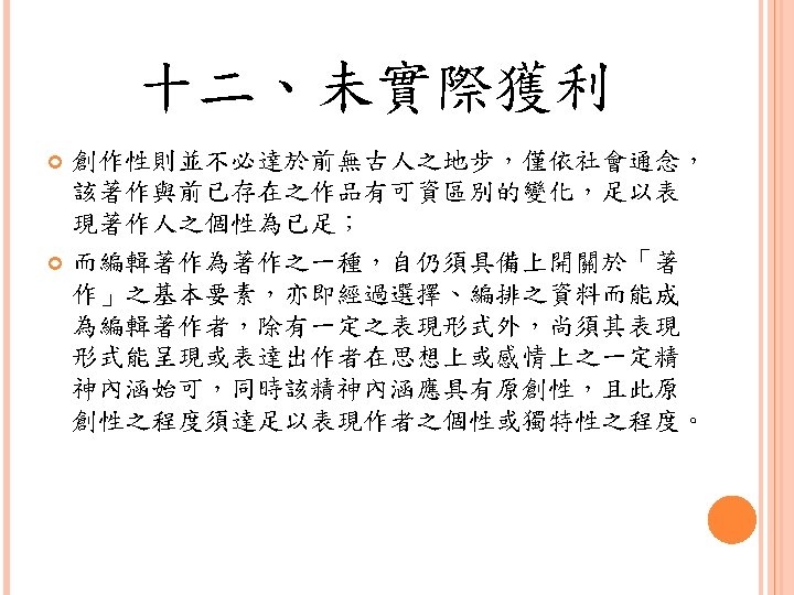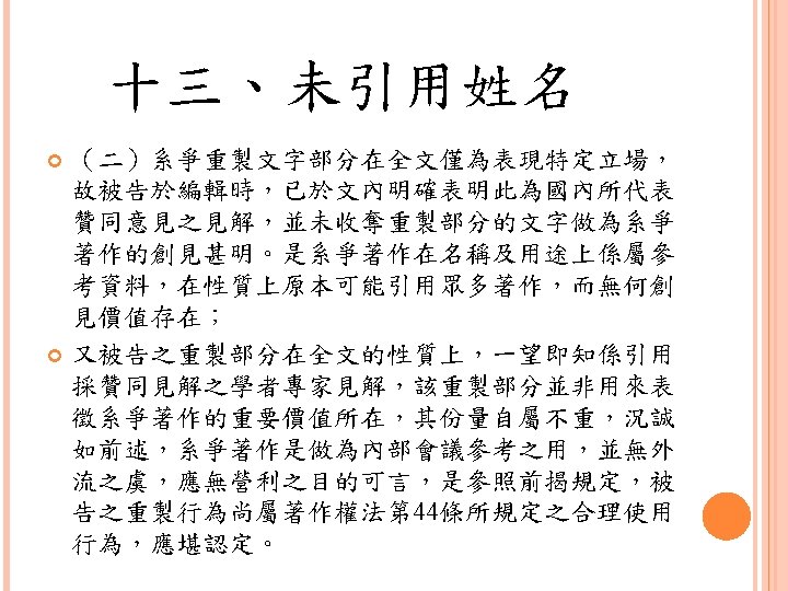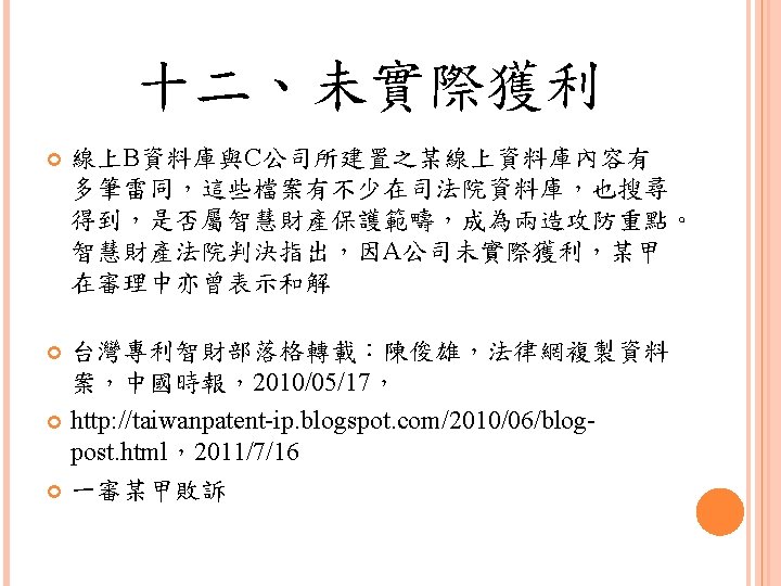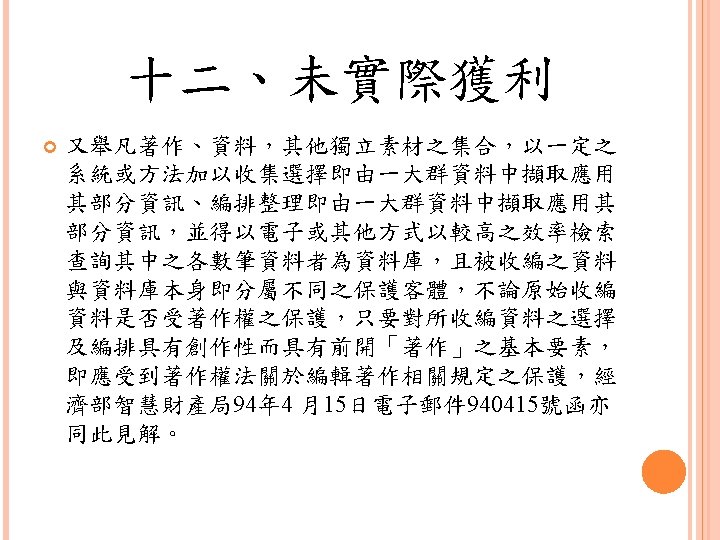 四、合理使用之判定參考 Lawrence Steingold, Technology and Employer Update: Court Eliminates Defenses for Downloading Copyrighted Materials, Querrey & Harrow, http: //www. querrey. com/assets/attachments/134. pdf, 2011/7/16 Copyright Act, Section 106, U. S. A. :Exclusive rights in copyrighted works Copyright Act, Section 107, U. S. A. :Limitations on exclusive rights: Fair use