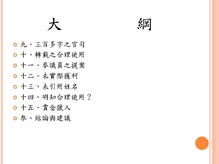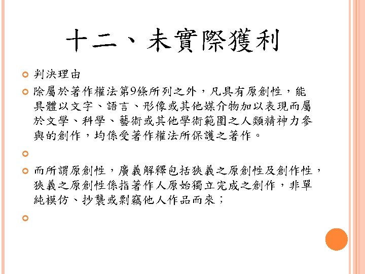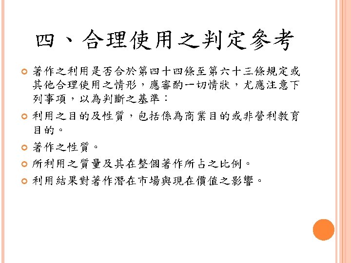 四、合理使用之判定參考 Under the Fair Use Doctrine and defense, the court must take into account: (1) the purpose and character of the use, including whether such use is of a commercial nature or is for nonprofit educational purposes; (2) the nature of the copyrighted work; (3) the amount and substantiality of the portion used in relation to the copyrighted work as a whole; and (4) the effect of the use upon the potential market for or value of the copyrighted work.