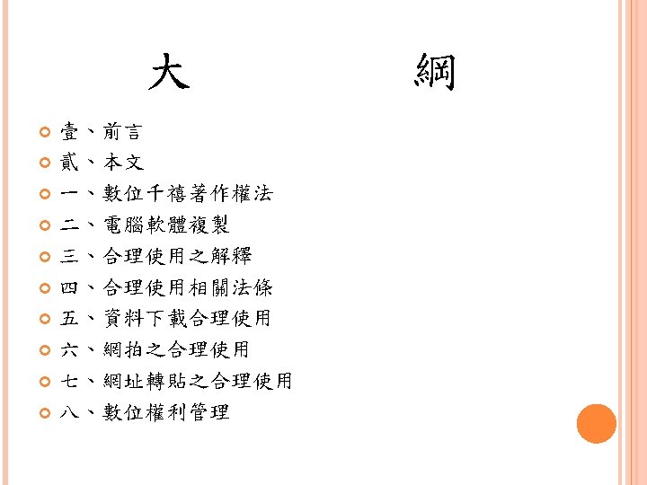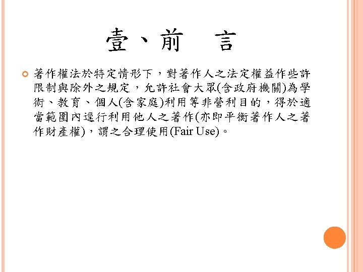 壹、前 言 Notwithstanding the provisions of sections 106 and 106 A, the fair use of a copyrighted work, including such use by reproduction in copies or phonorecords or by any other means specified by that section, for purposes such as criticism, comment, news reporting, teaching (including multiple copies for classroom use), scholarship, or research, is not an infringement of copyright. In determining whether the use made of a work in any particular case is a fair use the factors to be considered shall include — § 107. Limitations on exclusive rights: Fair use, Copyright Act.