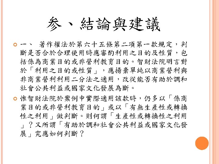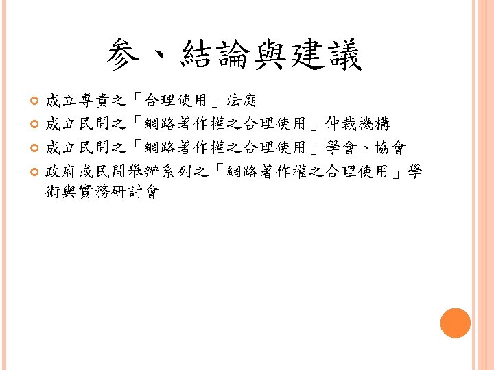 参、結論與建議 (Each of the numerical limits stated in 'i' and 'ii' above may be expanded to permit the completion of an unfinished line of a poem or of an unfinished prose paragraph. ) AGREEMENT ON GUIDELINES FOR CLASSROOM COPYING in NOT-FOR-PROFIT EDUCATIONAL INSTITUTIONS http: //www. rbs 2. com/copyr 2. htm