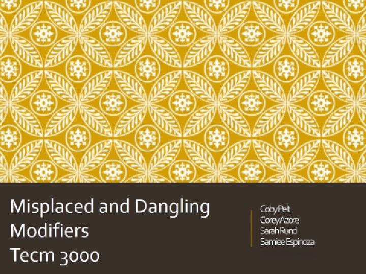 • A modifier that doesn’t refer to anything specific in the sentence. • They suggest but don’t name an actor. • Examples -After going to the library, the essay was finished. -Did the essay go to the library? -While eating lunch, the electricity went out. -Was the electricity eating lunch?