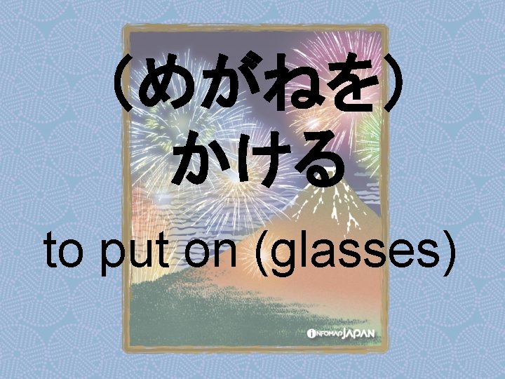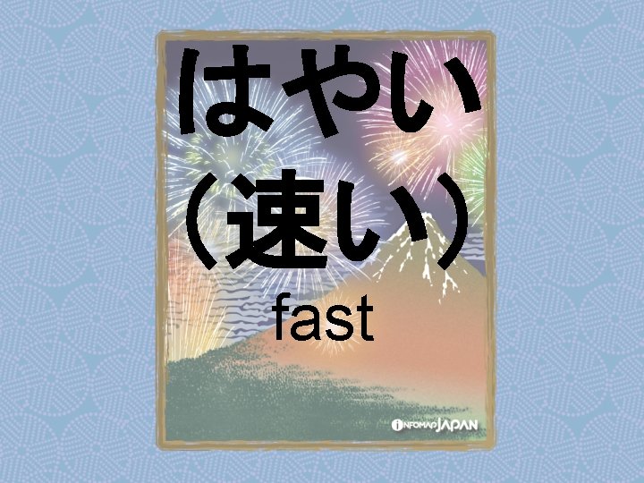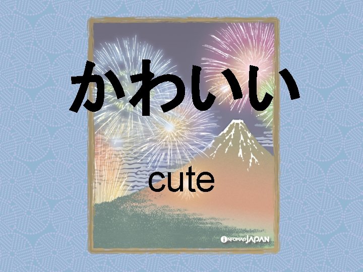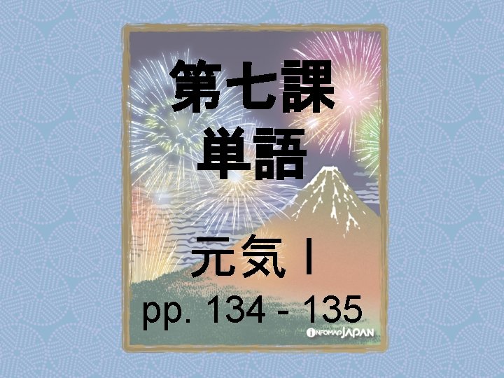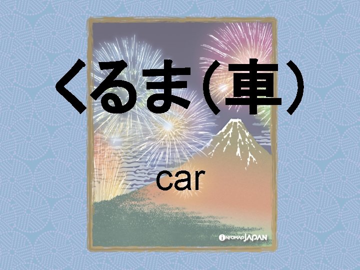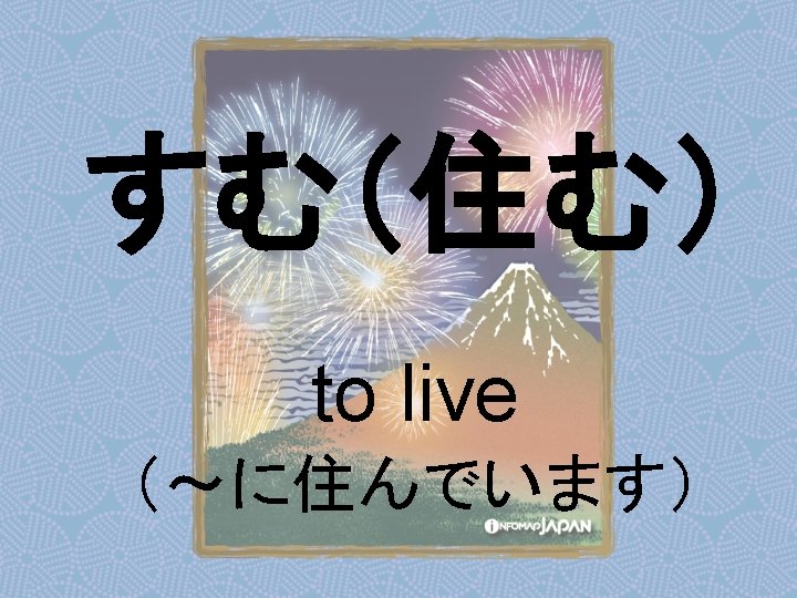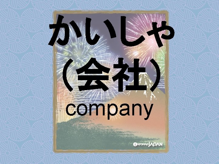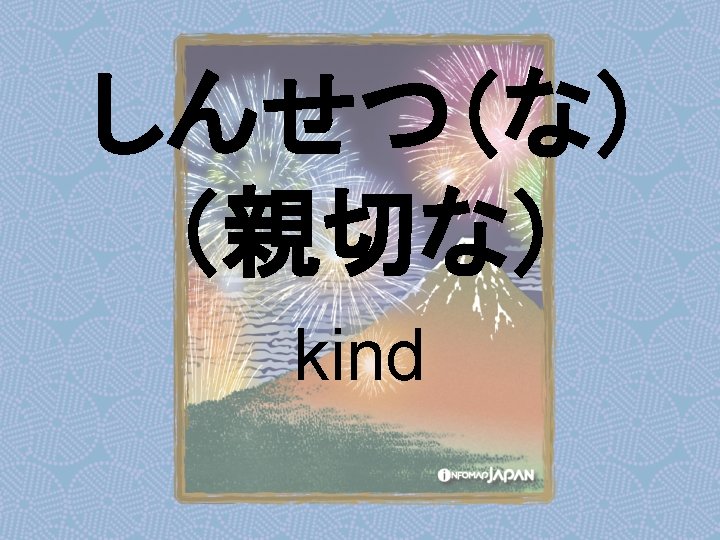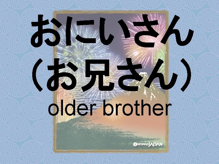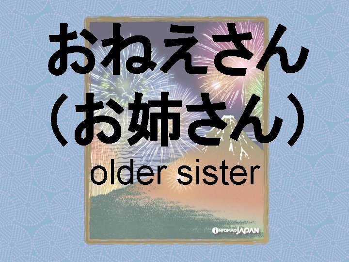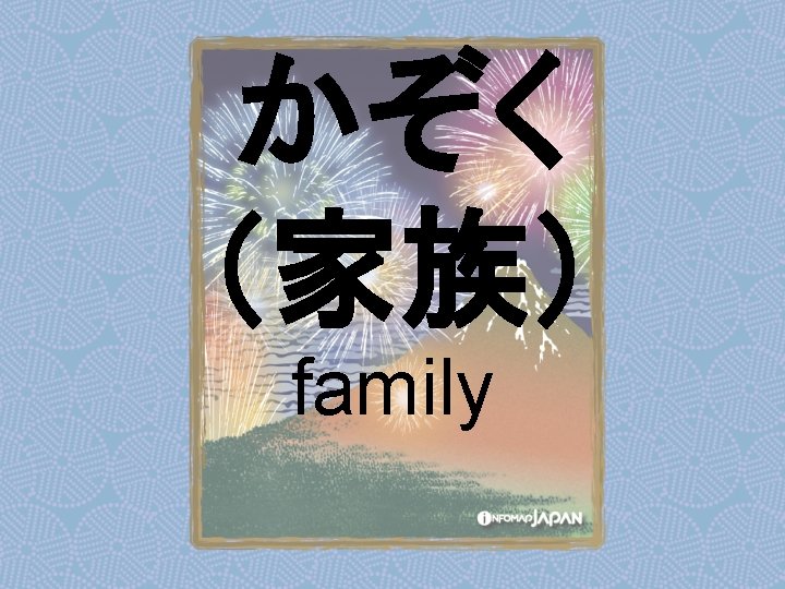 Nouns my older sister apartment younger sister younger Slides: 62 Download presentation Nouns あね(姉) (my) older sister アパート apartment いもうと (妹) younger sister おとうと (弟) younger brother きょうだい (兄弟) brothers and sisters くに(国) country; place of origin コンビニ convenience store しょくどう (食堂) cafeteria; dining commons Tシャツ T-shirt い - adjectives あたまがいい (頭がいい) bright; smart; clever (conjugates like いい) かっこいい great-looking (conjugates like いい) な - adjectives U - verbs かぶる to put on (a hat) しる(知る) to get to know はく to put on (items below your waist) ふとる (太る) to gain weight Ru - verbs きる(着る) to put on (clothes above your waist) やせる to lose weight Irregular verbs Adverbs and Other Expressions が but 〜にん (〜人) [counter for people] もちろん of course よかったら If you like