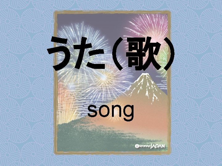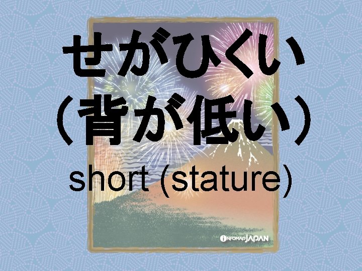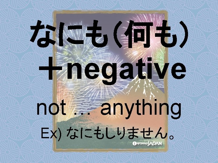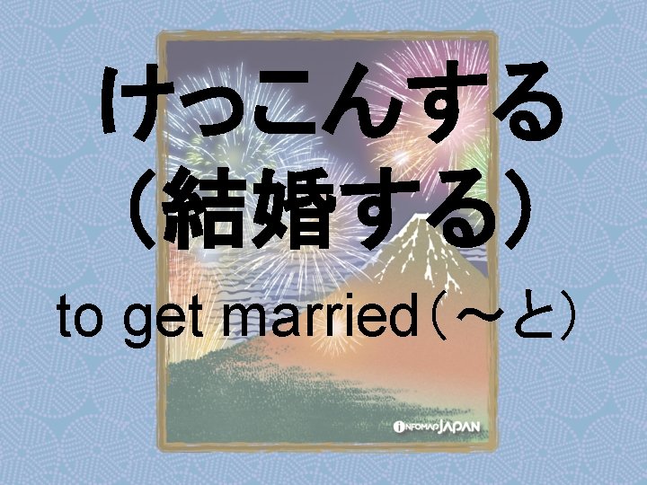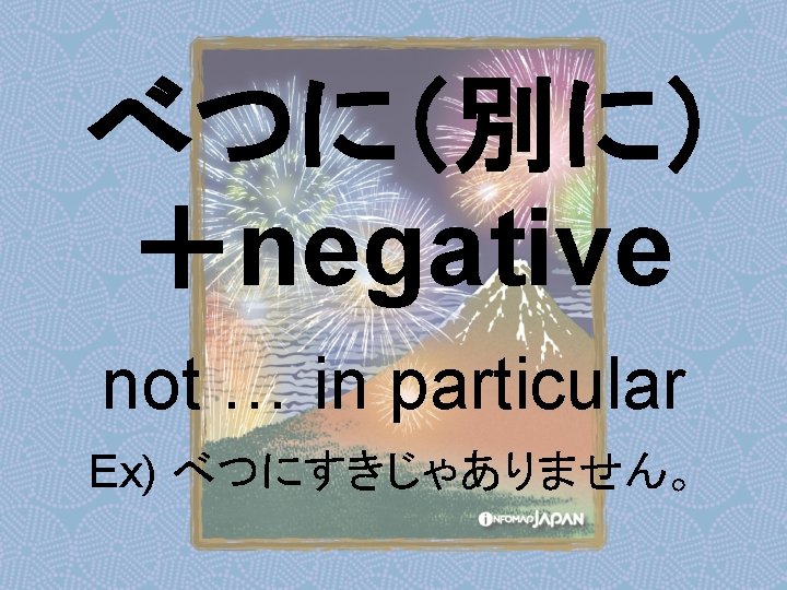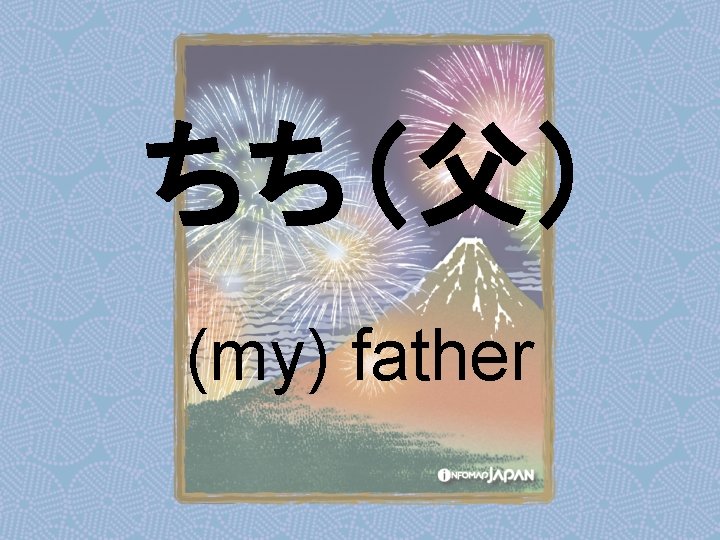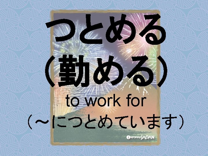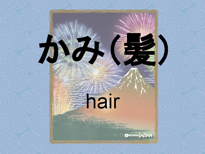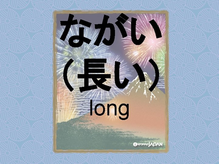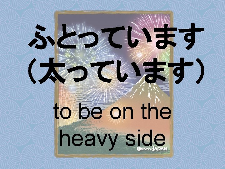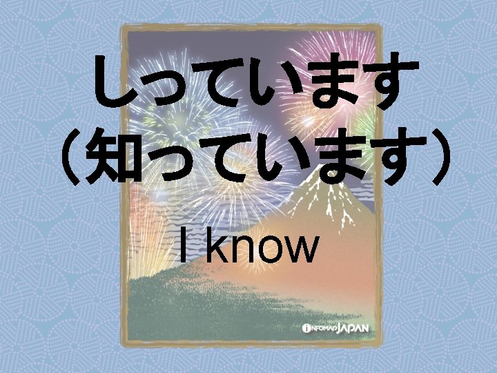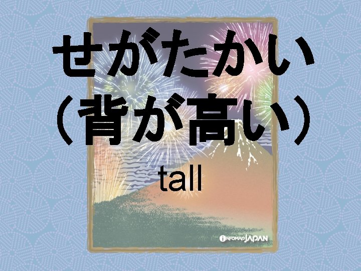 Nouns my older sister apartment younger sister younger Slides: 62 Download presentation Nouns あね(姉) (my) older sister アパート apartment いもうと (妹) younger sister おとうと (弟) younger brother きょうだい (兄弟) brothers and sisters くに(国) country; place of origin コンビニ convenience store しょくどう (食堂) cafeteria; dining commons Tシャツ T-shirt い - adjectives あたまがいい (頭がいい) bright; smart; clever (conjugates like いい) かっこいい great-looking (conjugates like いい) な - adjectives U - verbs かぶる to put on (a hat) しる(知る) to get to know はく to put on (items below your waist) ふとる (太る) to gain weight Ru - verbs きる(着る) to put on (clothes above your waist) やせる to lose weight Irregular verbs Adverbs and Other Expressions が but 〜にん (〜人) [counter for people] もちろん of course よかったら If you like