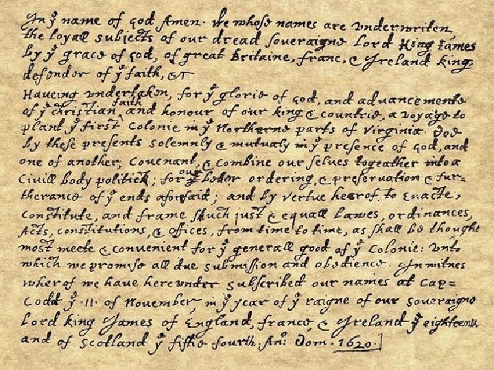 « Au nom de Dieu, Amen, Nous, soussignés, loyaux sujets de notre auguste souverain Jacques, par la grâce de Dieu Roi de Grande-Bretagne, de France et d’Irlande, Défenseur de la Foi. . . Ayant entrepris, pour la gloire de Dieu et le progrès de la Foi chrétienne, Pour l’honneur de notre roi et de notre Patrie, un voyage à cette fin d’établir la première colonie dans la partie nord de la Virginie ; par la présente, solennellement et mutuellement, en présence de Dieu et d’un chacun, nous convenons de nous constituer tous ensemble en un Corps social civil, en vue de notre meilleure organisation et sécurité, et de la poursuite de ces susdites Fins ; en vertu de quoi décrétons, constituons, établissons telles justes lois, égales pour tous, et ordonnances, actes, constitutions, charges, selon que de temps à autre il sera jugé opportun et convenable pour le bien général de la Colonie ; à quoi dûment promettons Soumission et Obéissance. En foi de quoi avons ici soussigné au Cap Cod le onzième jour de novembre, en l’année 1620 du Seigneur, sous le règne de notre Souverain seigneur Jacques, Roi d'Angleterre, de France 1 et d’Irlande, le dix-huitième et d’Écosse, le 54 e. » 1 Les revendications sur le trône de France n'étaient que symboliques et étaient invoquées par tous les rois d'Angleterre depuis Édouard III (1327 -1377), peu importe la quantité de territoires français contrôlés.