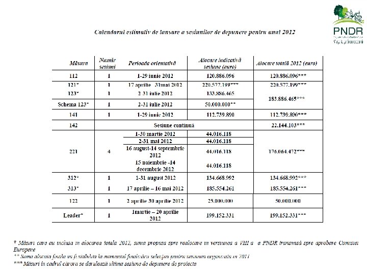 Noutăţi 2012 Ø Lansarea unei noi sesiuni pentru GAL-uri în perioada 1 martie-20 aprilie 2012. Alocarea totală este de circa 199 mil. euro, urmând a fi selectate circa 70 de GAL-uri Ø Realocarea a cca. 740 mil euro între măsuri (M 121; M 123; M 215; M 312 şi LEADER) Ø Modificarea procedurii de selecţie a proiectelor – „utilizarea sumelor disponibile constituite din economiile şi rezilieri pentru finanţarea proiectelor eligibile neselectate din cadrul ultimei sesiuni de depunere” Ø Măsura 121 „Modernizarea exploataţiilor agricole” • introducerea sectorului bovine pentru carne ca şi sector prioritar; • prelungirea perioadei de graţie de la data la care standardul devine obligatoriu pentru aplicarea standardelor privind nitraţi şi laptele crud până la 14. 10. 2013, respectiv 31. 12. 2014; • alocare separată pentru implementarea standardelor comunitare. Ø Măsura 123 „Creşterea valorii adăugate a produselor agricole şi forestiere” • prioritizarea micro-întreprinderilor pentru sacrificare şi procesare carne; • prioritizarea micro-întreprinderilor pentru colectare și procesare lapte; • alocare separată pentru implementarea standardelor comunitare.