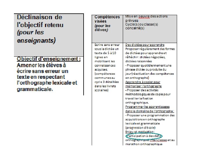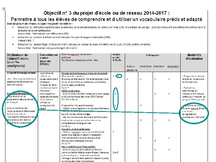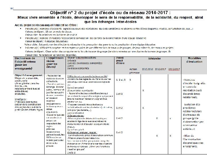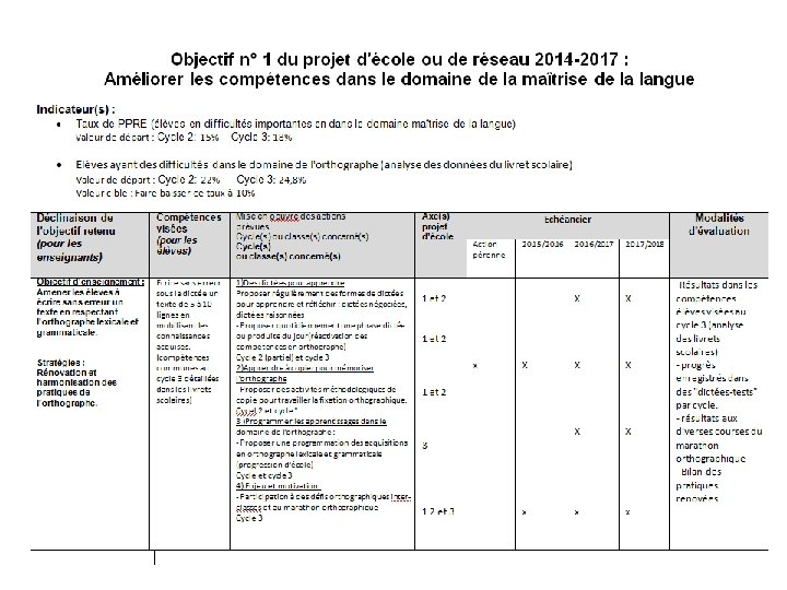Définition de 3 objectifs maximum par l’équipe d’école en lien éventuel avec ceux du collège (pour garantir la cohérence des parcours d’apprentissage et/ou assurer la continuité des actions école collège) ↓ Mise en œuvre d’un plan d’actions pour chaque objectif retenu. Chaque action est référée à l’un des 3 axes académiques. ↓ Modalités d’évaluation : (qualitative, quantitative)