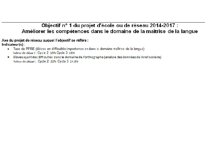 Que faire au mois de mars/avril ? • Faire un bilan du précédent projet d ’école (papier libre) • S’informer auprès des collèges qui élaborent également leurs contrats d’établissement et d’objectifs (trouver des points communs) • Recueillir les indicateurs chiffrés. • Recueillir le ressenti aussi des collègues (Où sont les difficultés ou les besoins? )