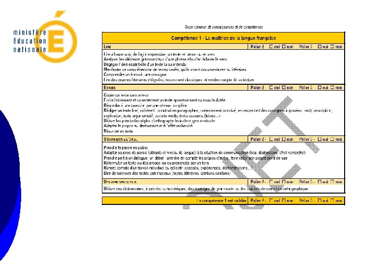Le livret personnel de compétences ¡ ¡ Le livret personnel de compétences est constitué, comme à l’école, d’attestations de maîtrise de compétences. C’est le même que celui du collège : c’est l’outil sur lequel l’enseignant de référence inscrit les compétences validées par l’élève au palier 2 ou au palier 3 (cf. atelier 2). Cette année, est proposé, à titre de projet, de travailler sur l’outil collège modifié pour pouvoir inscrire les validations au palier 2 ou au palier 3 selon le niveau de maîtrise de la compétence de l’élève Les grilles de référence du palier 3 sont disponibles sur Éduscol http: //eduscol. education. fr/soclecommun ¡ Les grilles de références du palier 2 sont inscrites dans les programmes de l’école