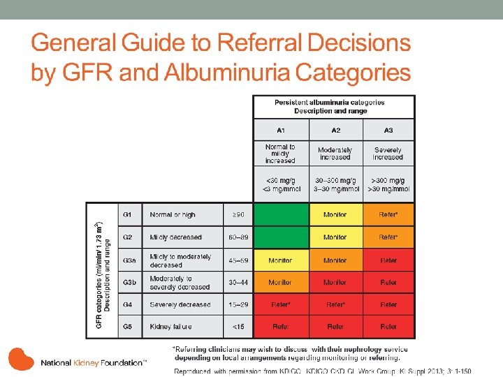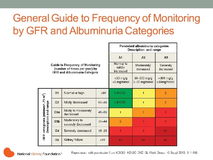 Popis a rozsah Kategorie GFR (ml/min/1, 73 m 2) Kategorie GFR chronických onemocnění ledvin(CKD) G 1 Normální nebo vysoká >90 G 2 Lehce snížená 60 -89 G 3 a Lehce až středně snížená 45 -59 G 3 b Středně a těžce snížená 30 -44 G 4 Těžce snížená 15 -29 G 5 Selhání ledvin <15 KDIGO 2013 Kidney Int Supplement 2013; 3, 19 -62