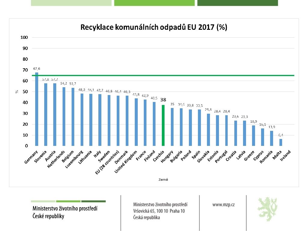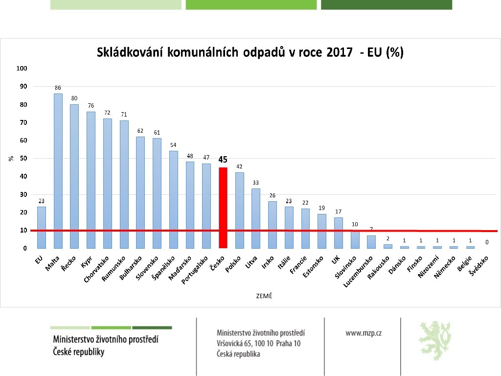 NOVÉ EVROPSKÉ CÍLE RECYKLACE A SKLÁDKOVÁNÍ KOMUNÁLNÍCH ODPADŮ ü Recyklace komunálních odpadů: ü 2025 – 55% ü 2030 – 60% ü 2035 – 65% ü Skládkování komunálních odpadů: ü 2030 – nepřijímat na skládku žádný odpad vhodný k recyklaci nebo jinému využití, zejména komunální odpad ü 2035 – pouze 10% nebo méně z roční produkce komunálních odpadů ukládat na skládky
