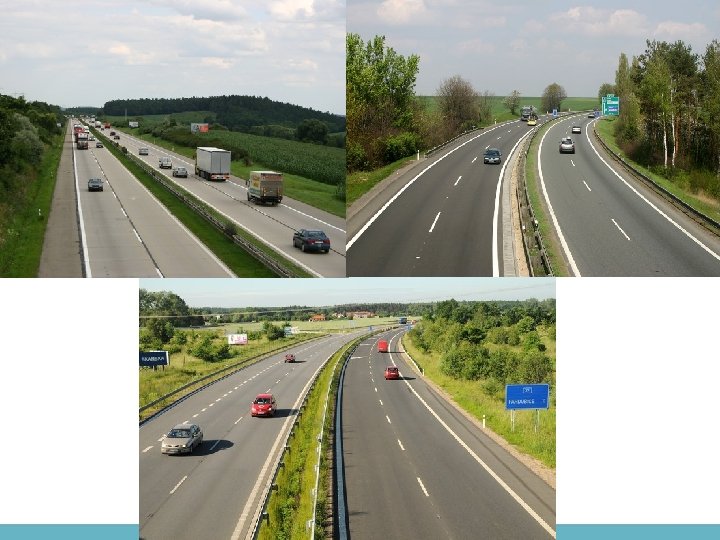Úspory a jiné přínosy „nového pojetí“ • Úspora finančních prostředků na páteřní síti pozemních komunikací a zkrácení termínu její realizace. • Mezi hlavní přínosy patří: – Ekonomičtější a z hlediska ŽP příznivější koncept realizace páteřních komunikací v České republice – Úspornější šířkové uspořádání a vhodnější směrové vedení u dnes plánovaných rychlostních silnic (více kopírující okolní terén) – Racionalizace dopravně technických charakteristik – Etapizace výstavby v odůvodněných případech, zejména u málo zatížených úseků silnic a dálnic (poloviční profily, třípruhy, hraniční úseky).