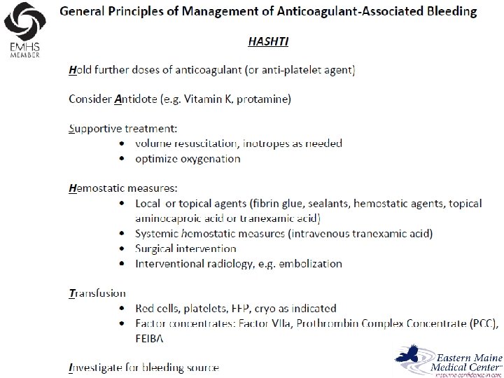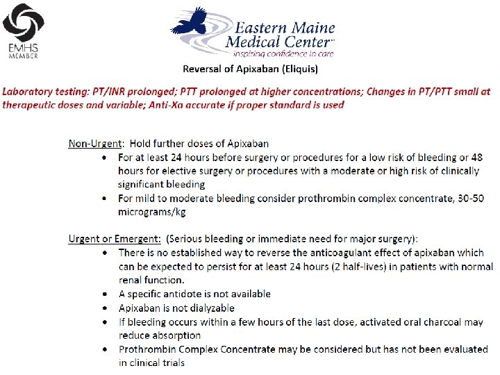 Surgery Dabigatran • Cr. CL ≥ 50 m. L/min stop 1 -2 days prior to surgery • Cr. CL < 50 m. L/min stop 3 -5 days prior to surgery Rivaroxaban • Stop ≥ 48 hours prior to surgery for moderate to severe bleeding risk • Stop ≥ 24 hours prior to surgery for normal risk of bleeding Apixaban • Stop ≥ 48 hours prior to surgery for moderate to severe bleeding risk • Stop ≥ 24 hours prior to surgery to low risk of bleeding