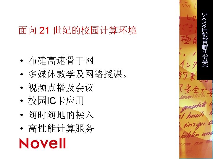 Novell校园网智能集成方案 帐号管理 Policy-based Network Management 安全管理 Web加速 Internet 应用 远程教学 Caching FTP Service Web Lessons Roaming Desktop Management Content Filtering Accounting/ Billing Server Management VPN NNTP(News) Service Router/Switch Management Firewall Messaging Service Bandwidth Management e. Commerce Security Infrastructure NDS - Directory Server Single Sign-on, PKI, LDAP 3, JNDI Low Level Service Platforms Net. Ware, NT, Solaris, Router, Switch, Access Server, JAVA OS 教 育 解 决 方 案