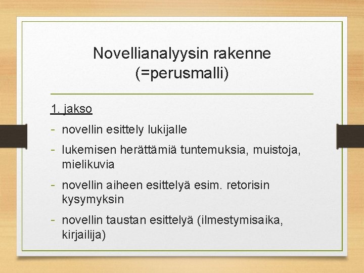 Novellianalyysin rakenne (=perusmalli) 1. jakso - novellin esittely lukijalle - lukemisen herättämiä tuntemuksia, muistoja, mielikuvia - novellin aiheen esittelyä esim. retorisin kysymyksin - novellin taustan esittelyä (ilmestymisaika, kirjailija)