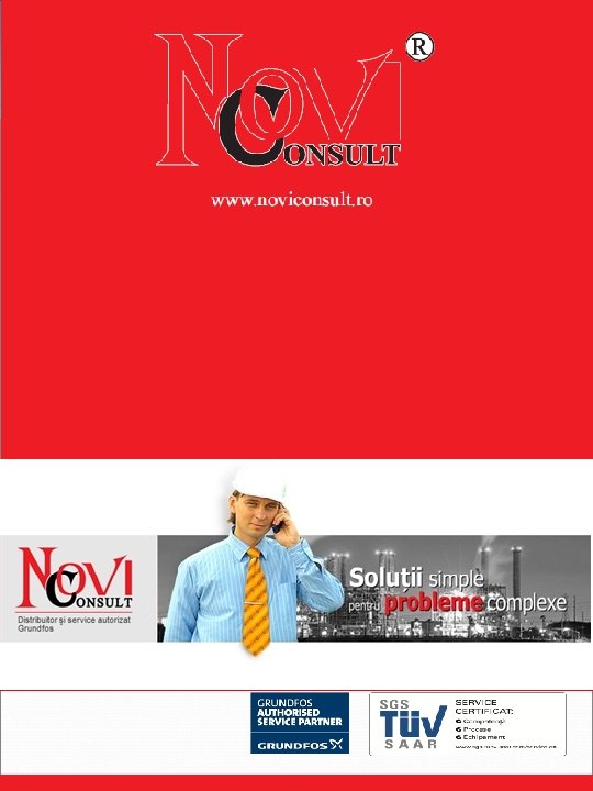 NOVI CONSULT este dedicata parteneriatelor si satisfacerii nevoilor de business ale clientilor sai, selectandu-si furnizorii de produse dintre cei mai renumiti in domeniul caruia se adreseaza. Astfel si-a dezvoltat intr-un mod coerent si constant competentele tehnice si portofoliul de produse si servicii, fiind Partener Autorizat de Service GRUNDFOS. ECHIPAMENTE SI SERVICII OFERITE In calitate de distribuitor GRUNDFOS, oferim o gama variata de pompe si sisteme de pompare cu aplicatii in instalatii de alimentare apa potabila, apa industriala subterana si recirculata, in instalatii industriale pentru vehiculare fluide tehnologice (solutii si compusi chimici, lichide alimentare, uleiuri industriale si altele), in centrale termice si in sistemele de distributie a agentului termic, in instalatii de frig industrial si climatizare, in instalatii automatizate tip hidrofor, in sistemele de evacuare namol si ape reziduale, in sisteme de dozare si in alte aplicatii. In calitate de Partener Autorizat de Service GRUNDFOS, prin specialistii nostri formati si pregatiti tehnic de GRUNDFOS: Ø acordam asistenta tehnica pentru asigurarea conditiilor de instalare, de exploatare, mentenanta mecanica, electrica, de comanda si protectie pentru produsele Grundfos ; Ø asiguram reglarea si optimizarea parametrilor de functionare a produselor Grundfos ; Ø preluam in service produse defecte, raspundem solicitarilor de constatare sau reclamatii, pentru echipamente aflate in perioada de garantie si/sau postgarantie ; Ø furnizam piese de schimb si accesorii originale sau agreate de Grundfos www. noviconsult. ro