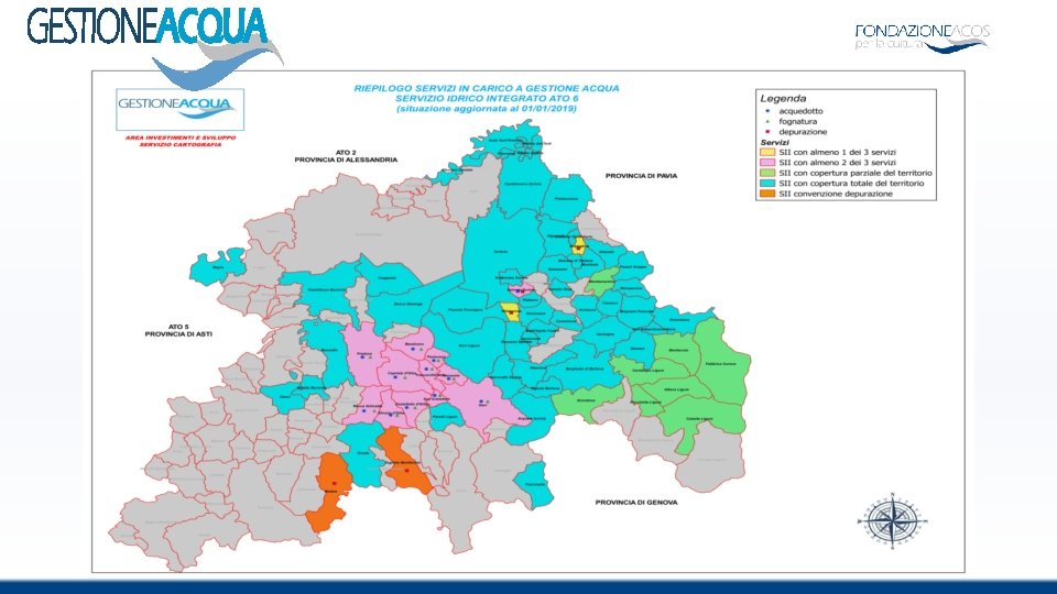 Gestore del Sistema Idrico Integrato sub-ambito «Novese - Ovadese - Tortonese» EGATO n. 6 Alessandrino Dal 01 gennaio 2017 gestisce i servizi di acquedotto, fognatura, depurazione di 72 Comuni nella Provincia di Alessandria Bacino di competenza: dall’asse fluviale dello Scrivia ai territori collinari e montani ricompresi nelle Vallate Borbera, Curone, Grue, Ossona, Orba e Bormida.