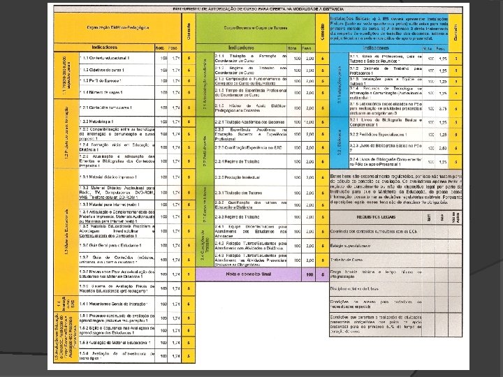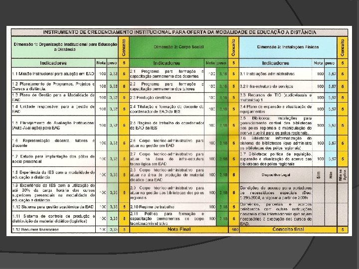 Instrumentos de Avaliação A partir de agora as novas regras serão observadas pelo Instituto Nacional de Estudos e Pesquisas Educacionais Anísio Teixeira nos processos que tramitam no âmbito do MEC e que versam sobre a modalidade de ensino. Os critérios são de pontuação para diversas dimensões (Organização Institucional, Corpo Social e Instalações Físicas), variando de 1 a 5.