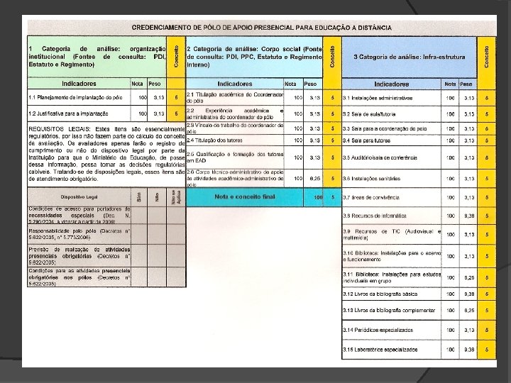 Instrumentos de Avaliação A regulamentação proposta considera a necessidade da existência de aulas presenciais obrigatórias na formação dos alunos, com pólos de apoio. Os instrumentos de avaliação, homologados pelas portarias nº 1. 047 , nº 1. 050 e nº 1. 051 estabelecem um conjunto de regras sistêmicas. Novo processo de avaliação da educação superior brasileira ofertada na modalidade a distância.