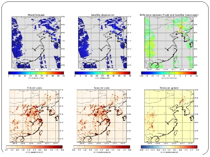 Chemical transport model �CHIMERE �Domain: East Asia (18 – 50 o N, 102 – 1320 E ) �Horizontal resolution: 0. 250 x 0. 25 0 �Vertical resolution: 8 layers up to 500 h. Pa �Meteorological data: ECMWF �Initial emission inventory: MEIC (2010) for China, INTEX-B (2006) for outside China