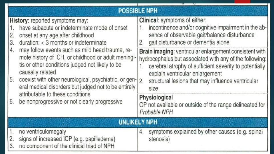Other symptoms: -Psychiatric disturbances: depression , bipolar disorder, paranoia , aggressiveness -11% identical to those of idiopathic parkinsonism Infrequently: -SIADH, syncope, … Symptoms not expected with NPH (solely as a result of NPH): -papilledema, seizures (prior to shunting), headaches