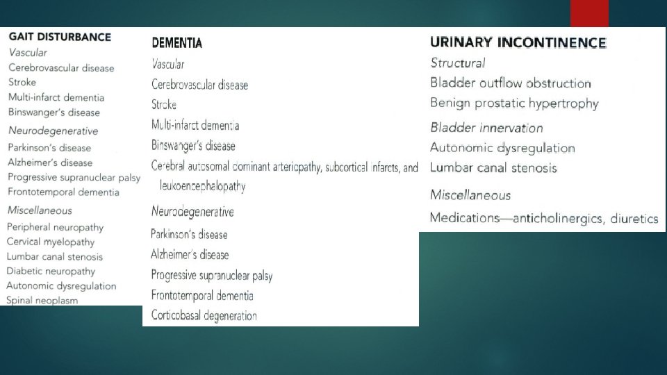 DDx. : -AD: cortical deficit: aphasia , apraxia , agnosia -Binswanger's disease: * most difficult DDx. * a form of subcortical vascular encephalopathy. * predominantly frontal cognitive deterioration. * gait disturbance: ataxia or motor dysfunction, or both. * similar MRI features. * FND may be present.