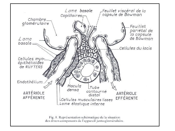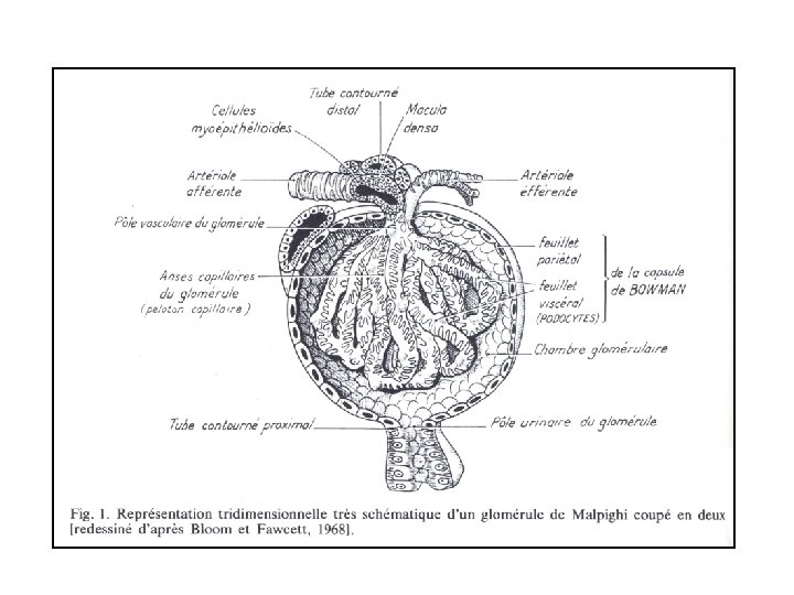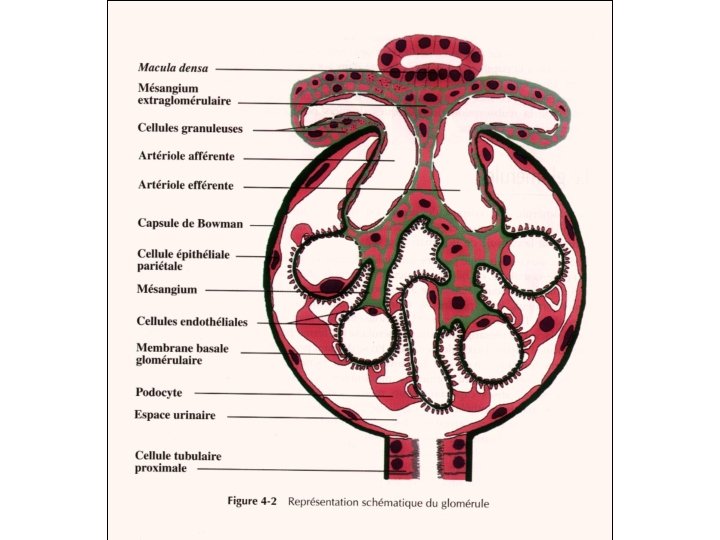 Glomérules • Structure générale – – – Peloton vasculaire entre artériole afférente et efférente : Flocculus Enclos dans un espace (espace urinaire) Limité par une capsule de Bowman 2 pôles: vasculaire (alimentation), tubulaire (excrétion) Pôle vasculaire : continuité avec la capsule de Bowman, capillaires glomérulaires, et artérioles juxta-glomérulaires – Pôle tubulaire en continuité avec le tube contourné proximal – Pôle vasculaire : dans l’angle artériole afférente et efférente et tube contourné distal (TCD) : appareil juxtaglomérulaire – ===>Artérioles juxta-glomérulaires, macula densa du TCD, le lacis (continuité avec le mésangium)