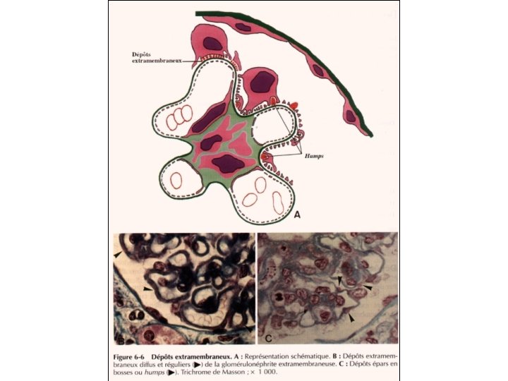 Dépôts anormaux 1 • Extramembraneux – Versant externe de la paroi glomérulaire (IF : Ig. G et C 3) – Soit dépôts réguliers: GEM (IF, granuleux) – Soit Humps de grande taille: GNA (IF, Ig. G et C 3, aspect en ciel étoilé) • Endomembraneux – Sous endothéliaux (IF: Ig. G, Ig. M, C 3) entre MB et cellules endothéliales, en virgule ou croissants de lune, en IF: dépôts en coups d’ongle – Mésangiaux (IF : Ig. A, Ig. G, C 3), dans la matrice mésangiale, arrondis. Ig. A+C 3= maladie de Berger. Ig. G, C 3, C 1 Q, C 4 = LED – Intracapillaires (thrombi, Ig. A, Ig. M, Ig. G, facteurs du complément) : cryoglobulinémie mixte et LED, fibrine (microangiopathie thrombotique)