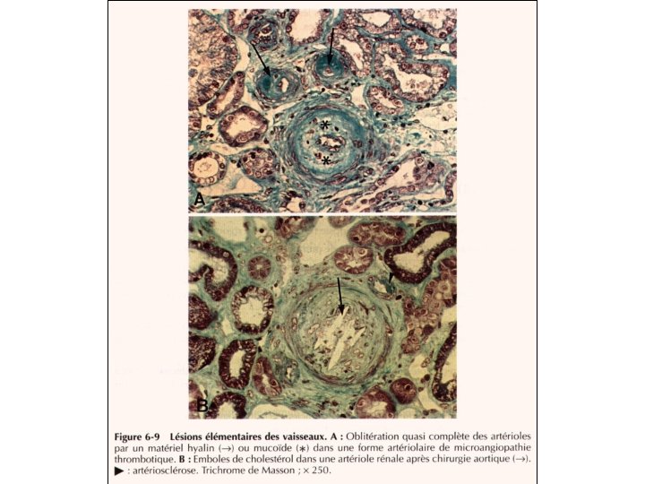 Lésions élémentaires des vaisseaux intrarénaux • Artères – Artériosclérose, endartérite fibreuse – Thrombose (MAT, nécrose corticale, infarctus) – Angéite nécrosante – Embols de cholestérol • Veines – Thromboses • Capillaires – Congestion, suffusion hémorragique