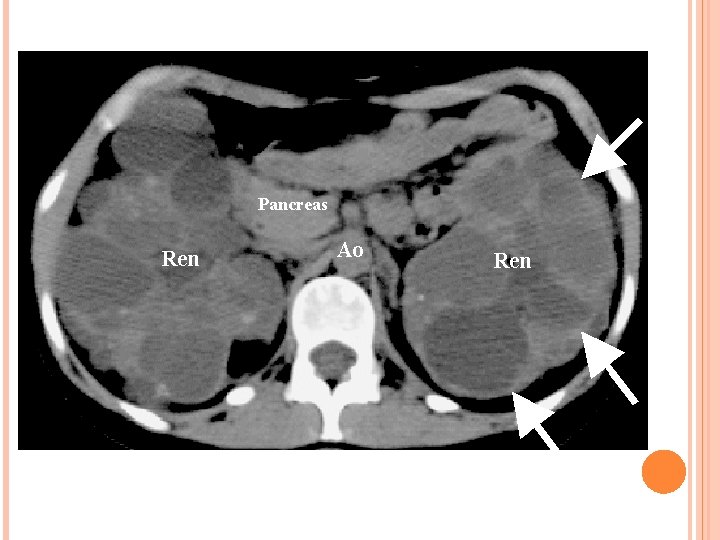 Rein : kystes rénaux – Apparaissent vers 20 ans – Douleurs lombaires et abdominales – hématurie macroscopique et hémorragie intra kystique – Infection urinaire et infection kystique – lithiases urinaires – HTA – IRCT – Cancer du rein