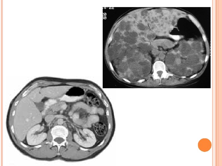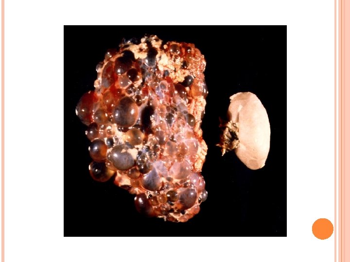 Foie : kystes hépatiques – ¾ patients – Hépatomégalie importante – Pas d’insuffisance hépatique mais Compression, infection de kyste, hypertension portale Rare : kyste pancréas, ovaires, testicules