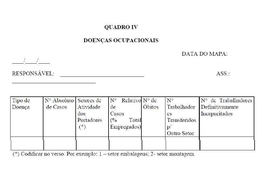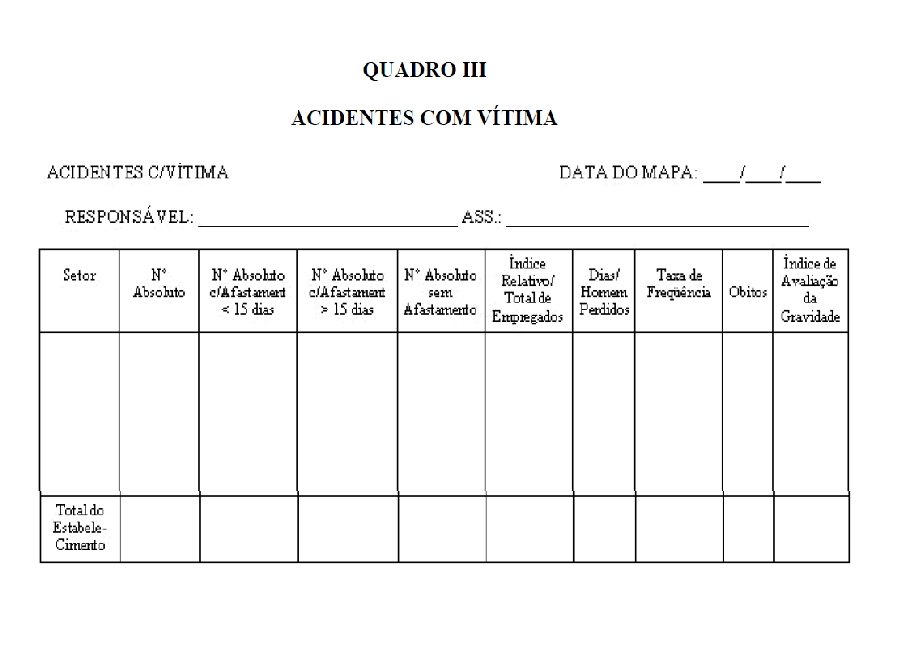 i) registrar mensalmente os dados atualizados de acidentes do trabalho, doenças ocupacionais e agentes de insalubridade, preenchendo, no mínimo, os quesitos descritos nos modelos de mapas constantes nos Quadros III, IV, V e VI, devendo a empresa encaminhar um mapa contendo avaliação anual dos mesmos dados à Secretaria de Segurança e Medicina do Trabalho até o dia 31 de janeiro, através do órgão regional do MTb;