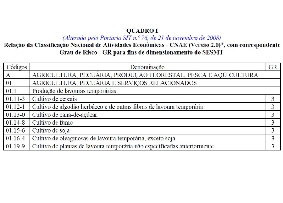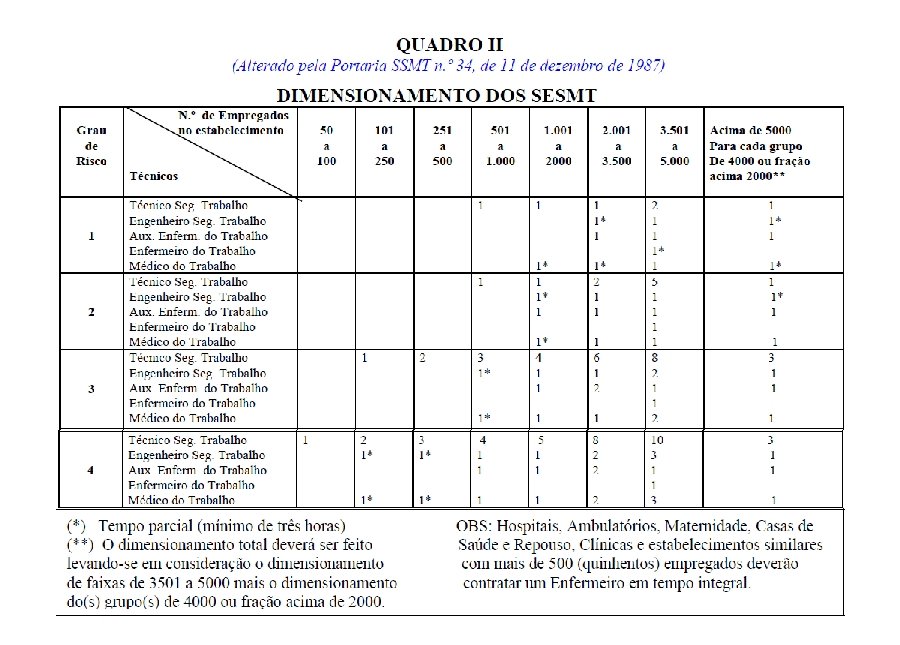 4. 2 O dimensionamento dos Serviços Especializados em Engenharia de Segurança e em Medicina do Trabalho vincula-se à gradação do risco da atividade principal e ao número total de empregados do estabelecimento, constantes dos Quadros I e II, anexos, observadas as exceções previstas nesta NR.
