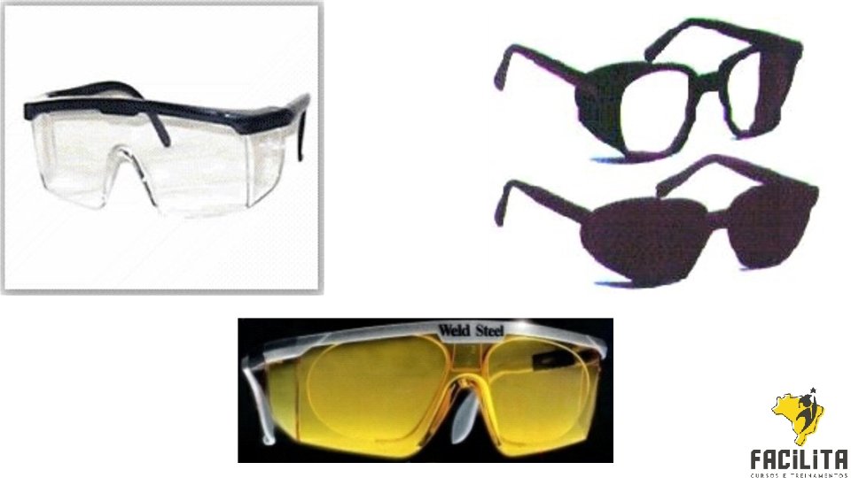 EPI para proteção dos olhos e face �Óculos: consiste de armação com hastes reforçadas, proteção lateral total ou parcial. A lente pode ser de policarbonato ou cristal, nos tipos incolor, fumê ou colorido. Os óculos de segurança têm como função dar proteção :