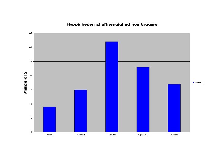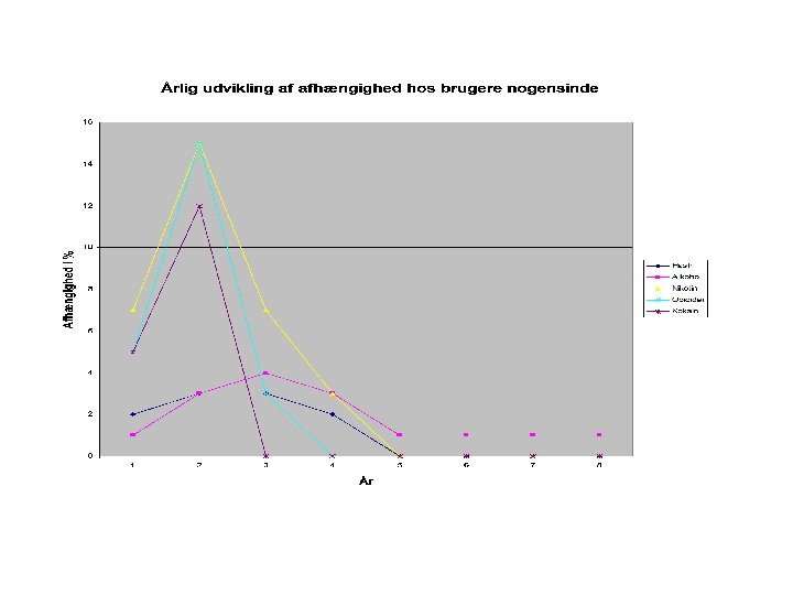 Afhængighed > 2 af følgende > 1 måned eller gentagne gange i løbet af et år 1. Trang 2. Svækket evne til at styre indtagelsen, eller nedsætte brugen 3. Abstinenssymptomer 4. Toleransudvikling 5. Dominerende rolle med hensyn til prioritering og tidsforbrug 6. Vedblivende brug trods erkendte skadevirkninger