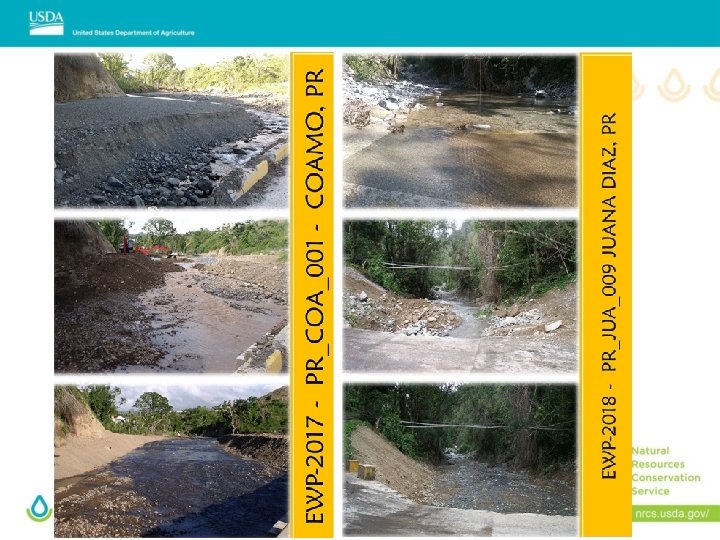 EWP – Project Impact EWP Type # of Projects Approximate Cost Population Impacted Properties Impacted Approximate Benefit Exigency 439 $30, 101, 552 11, 759 12, 229 $158, 261, 410 Non-Exigency Emergency 237* $22, 899, 152 * * Non-Exigency Funds not allocated to Caribbean Area at this time. * 237 Emergency Projects currently, Final project number will vary, Still evaluating sites. Source (left-right): Norberto Valentín, NRCS Utuado; Edwin Martínez-Martínez, NRCS-WDC; Lydia Collazo, NRCS-Caguas.